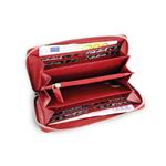 2 přihrádky na bankovky a další 2 přihrádky, do kterých lze vložit mobilní telefon až do velikosti 5,5 palce nebo bankovky, zipová kapsa na mince, 12 kapes na kreditní karty, občanský průkaz nebo řidičský průkaz, kovový hlavní zip. Základní rozměr 20 x 11 cm.