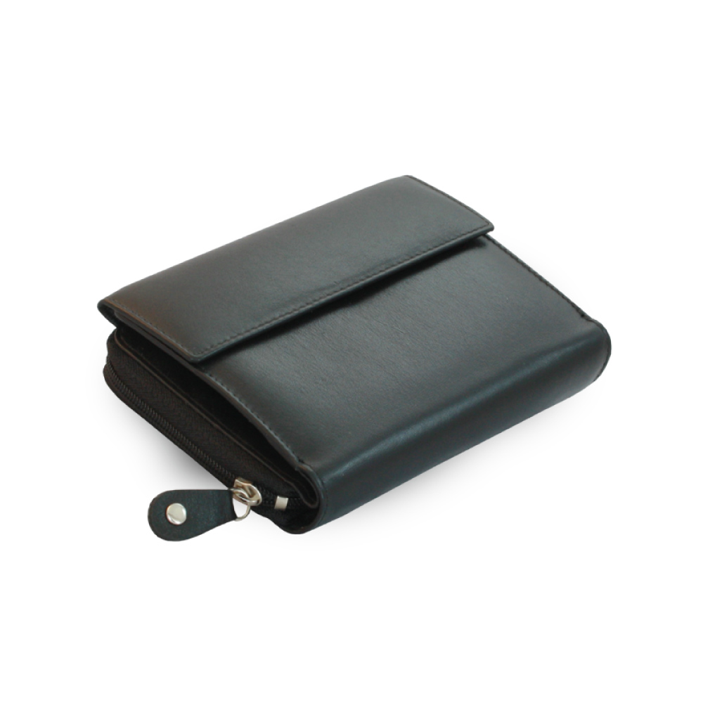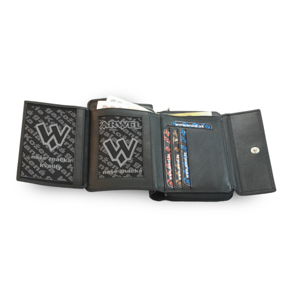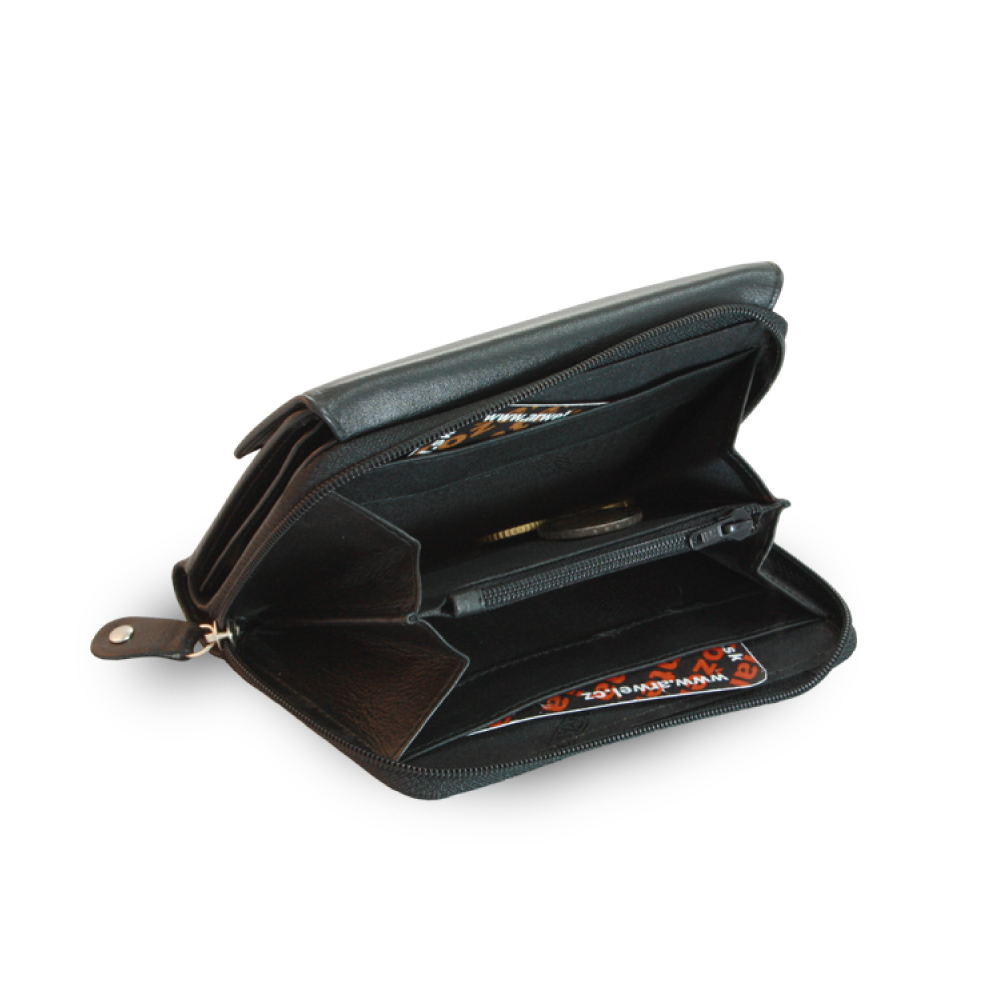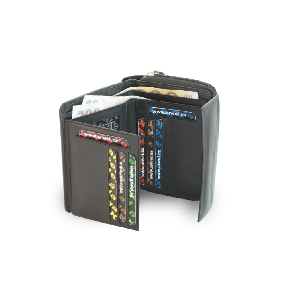 Pod klopnou po rozevření 2 přihrádky na bankovky, 8 kapes na kreditní karty, 1 skrytá a dvě průhledné kapsy, pod zipem umístěným po obvodu zdvojená zipová kapsa na mince s 2 všitými a jednou zipovou kapsičkou.Základní rozměr 10 x 14 cm.Materiál NAPPA, barva černá.