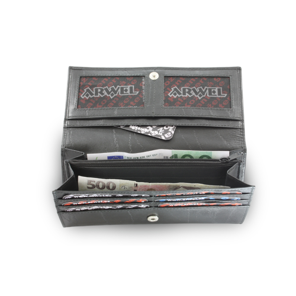 2 přihrádky na bankovky, zipová kapsa na mince,