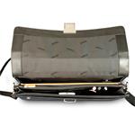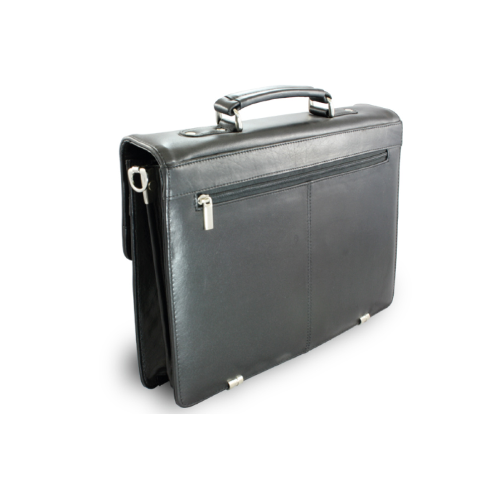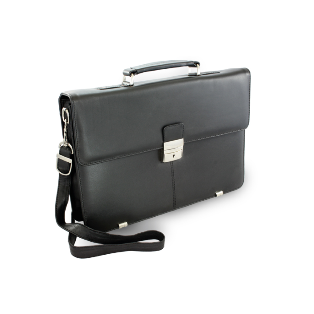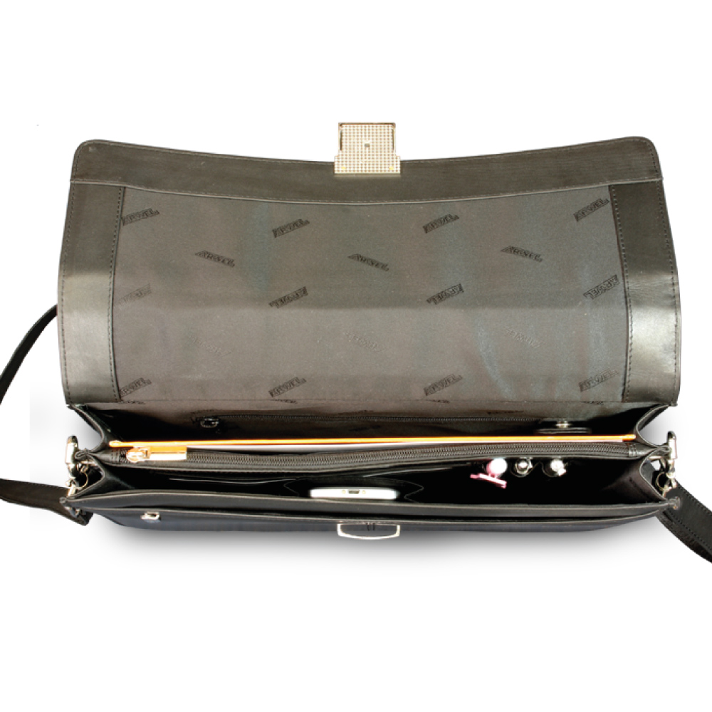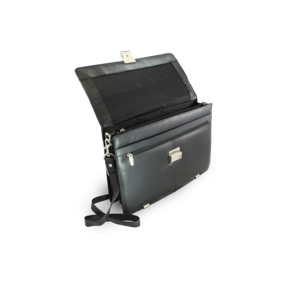 2 vnitřní separace oddělené zipovou kapsou, 2 zipové kapsy, vnitřní kapsičky na 6 kreditních karet (vizitky), mobil, doklady a psací potřeby, odepínatelný kroužek na klíče, venkovní zipová kapsa odepínatelný popruh přes rameno, ochrana spodních hran. Základní rozměr 37 x 26 x 9 cm. Materiál NAPPA, barva kůže - černá, kování - matný nikl