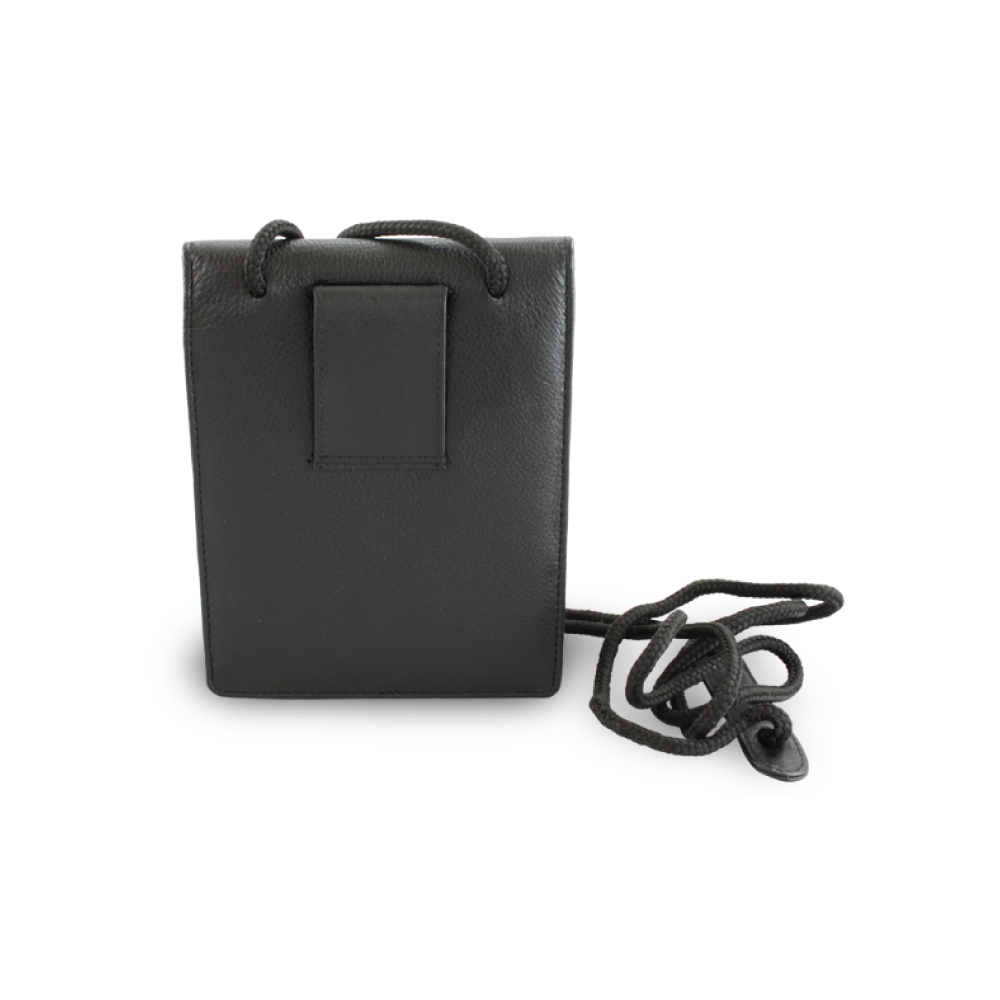 vzadu poutko pro opasek. Součástí je dlouhý textilní popruh pro zavěšení na rameno nebo na krk.