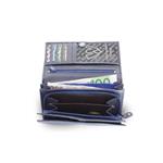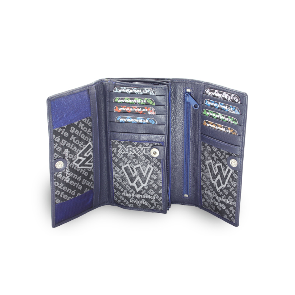 2 přihrádky na bankovky + 1 zdvojená zipová kapsa na mince, 8 kapes na kreditní karty, 3 průhledné kapsy, 1 vnitřní a 1 zipová kapsa, 1 zipová a 1 otevřená zadní kapsa.Základní rozměr 9,5 x 18 cm.Materiál NDM, barva tmavě modrá.'