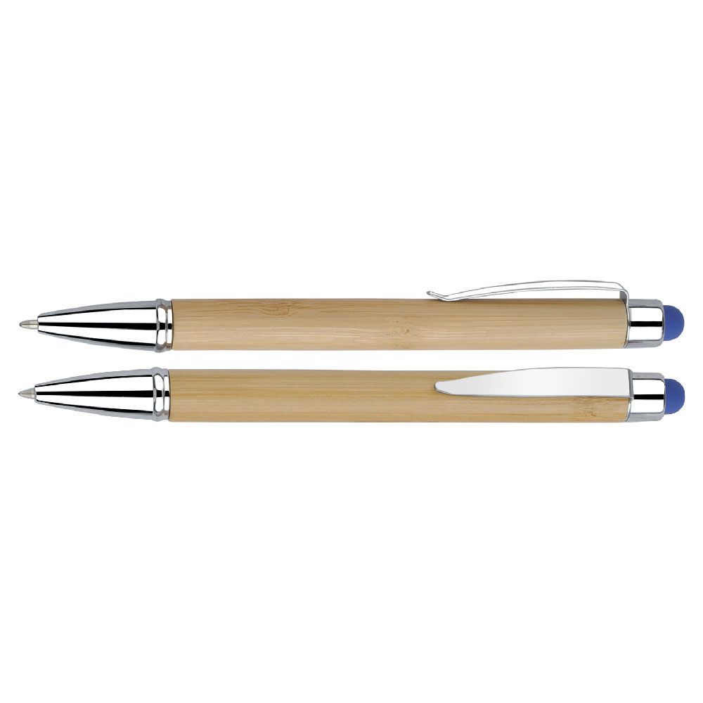 Bambusové kuličkové pero s gumou pro ovládání dotykových displejů a kovovým klipem.