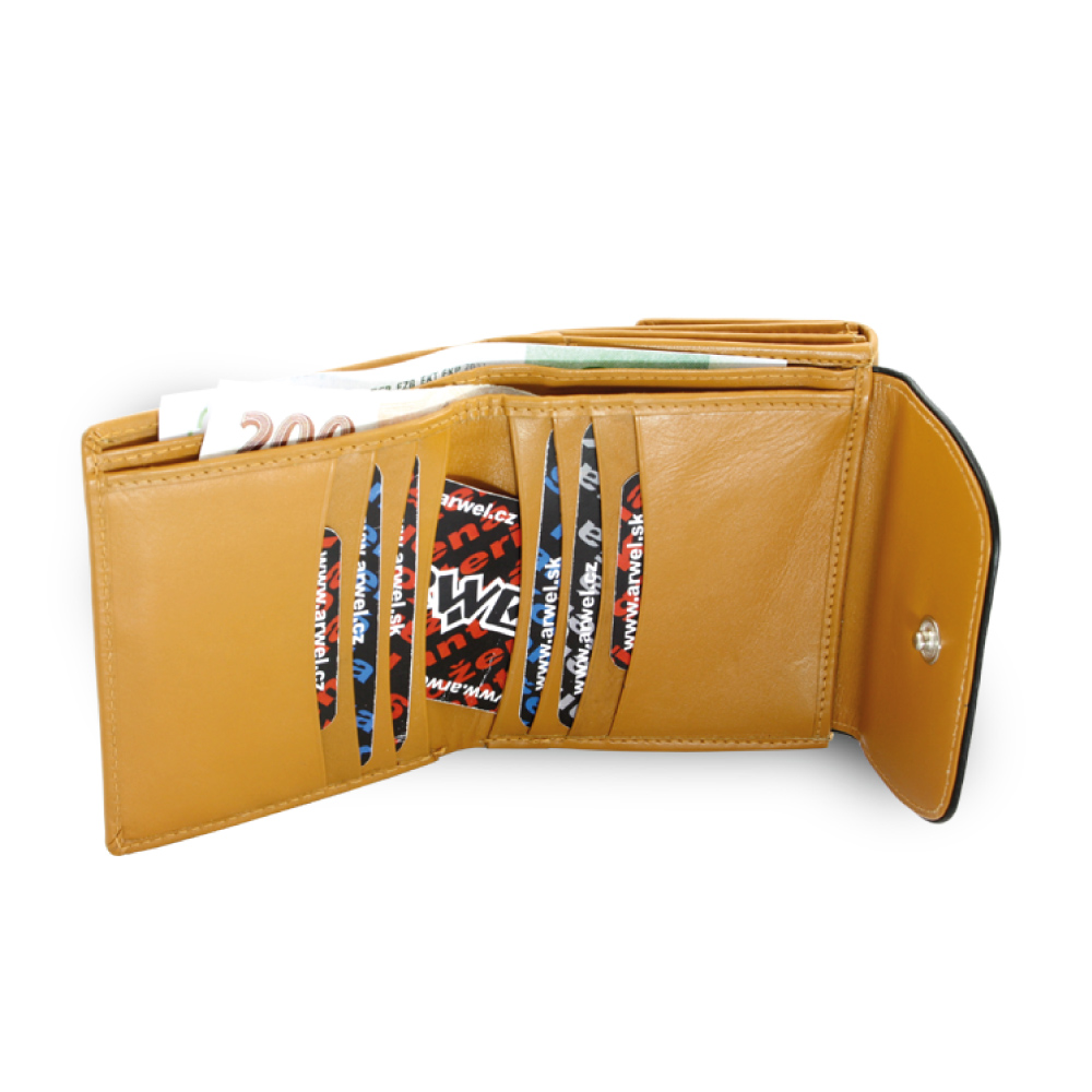 2 přihrádky na bankovky, klopnová dvoukapsa na mince,