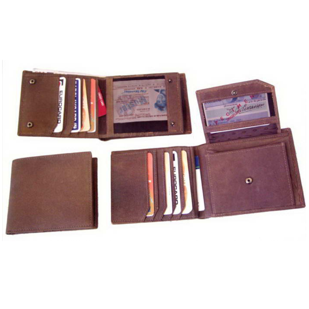 Pánská kožená peněženka - hnědáPopis: 2 přihrádky na bankovky, kapsa na mince, 10 kapes na kreditní karty, 3 vnitřní a 1 průhledná kapsaSpecifikace: zákl. rozměr 12,5x10,5 cm, material: HUNTER