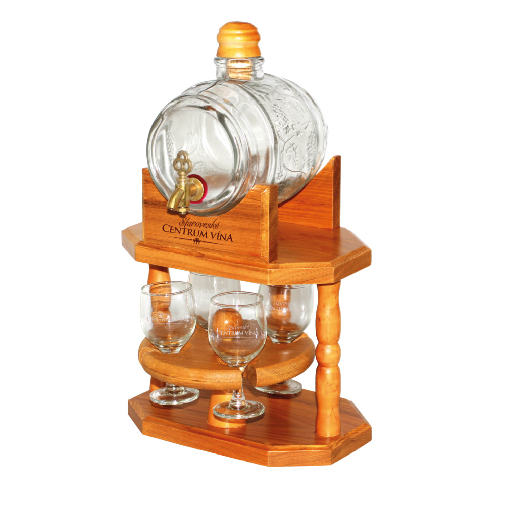 Skleněný soudek na dřevěném podstavci se 4 skleničkami na otočném tácu.