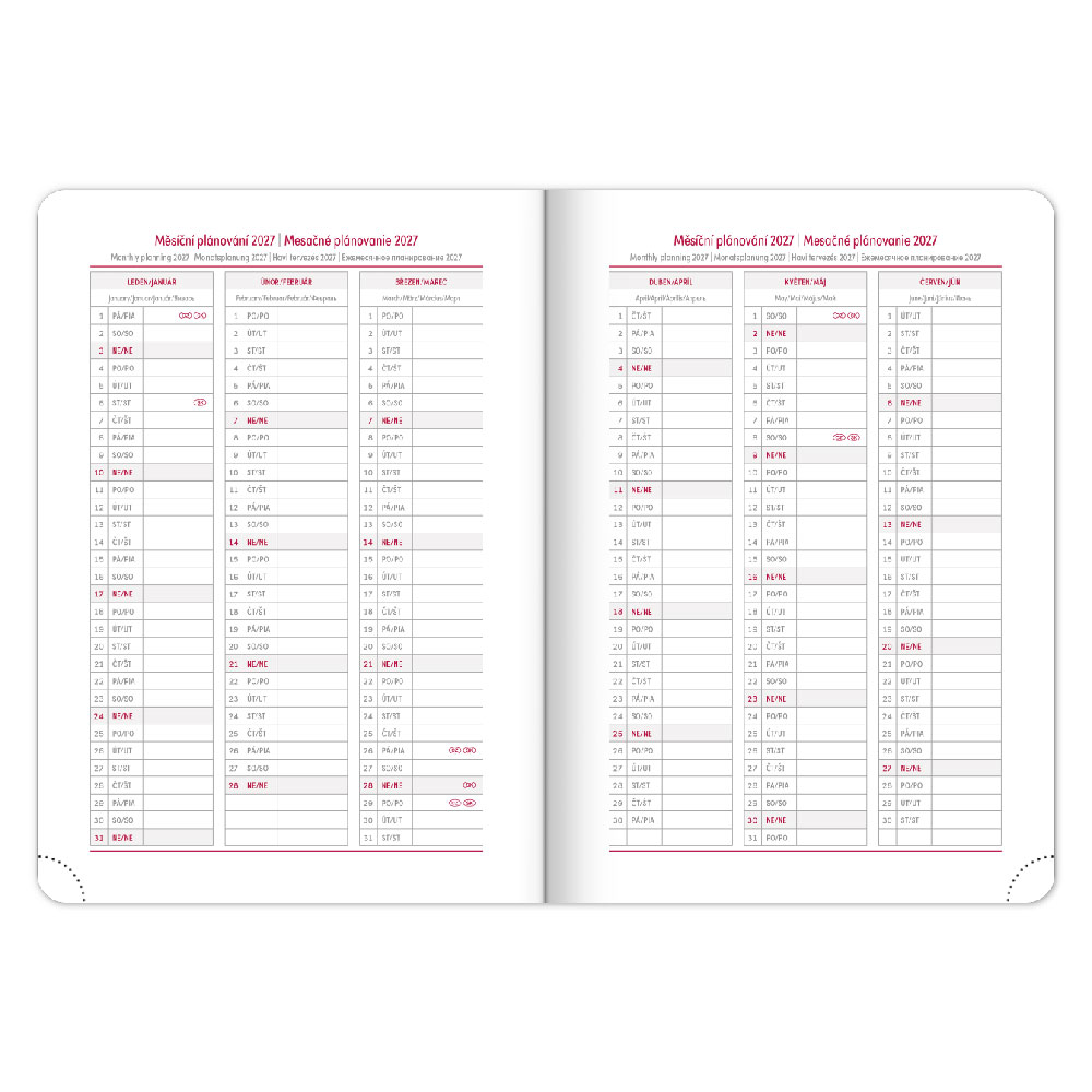 Diář obsahuje: místo pro osobní údaje, měsíční plánování 2026 a 2027,