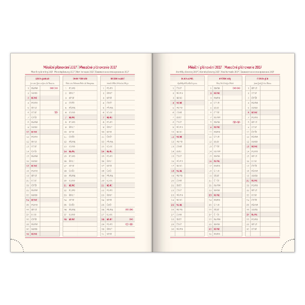 Diář obsahuje: místo pro osobní údaje, měsíční plánování 2026 a 2027,
