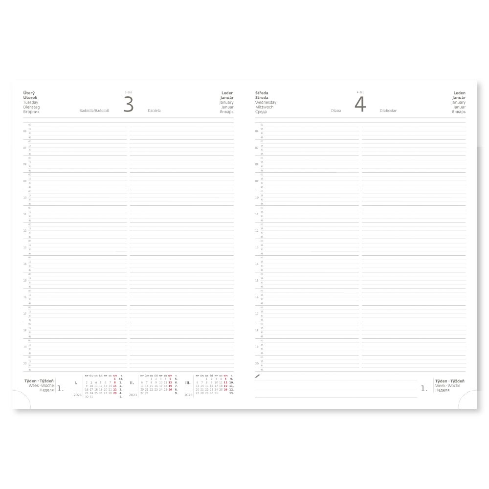 mezinárodní svátky, roční výhled, denní layout, adresář.