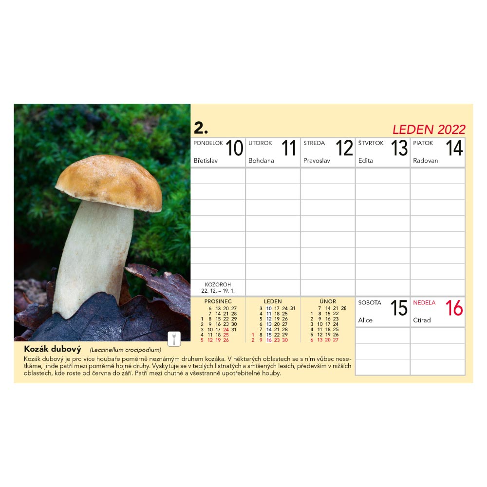 Rozměr: 230 x 140 mmKalendárium: týdenní českéRozsah kalendáře: 58 listůPlocha pro potisk: 230 x 30 mm