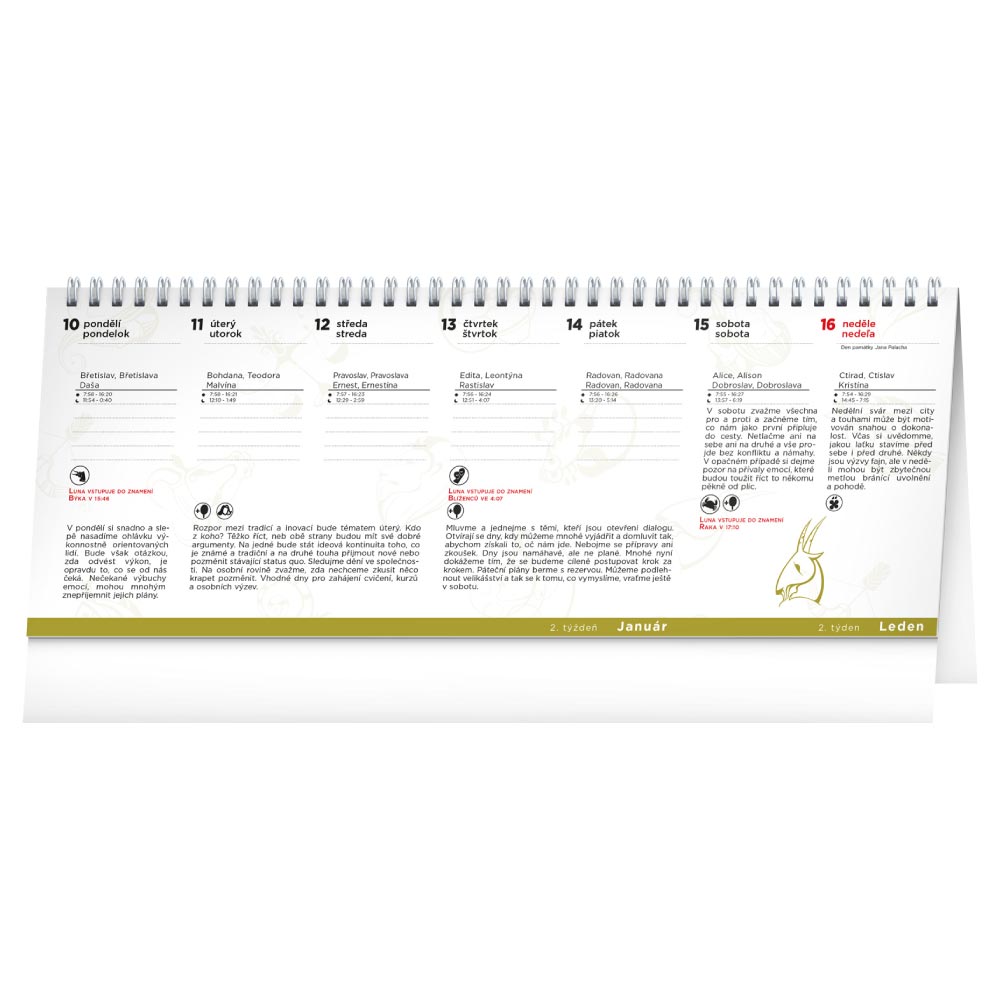 Rozměr: 33 x 12,5 cm Kalendárium: české a slovenské týdenní Rozsah kalendáře: 34 listů (oboustranný tisk) Vazba: dvojitá spirála Papír: 100 g/m2 Plocha pro potisk: 33 x 2,9 cm