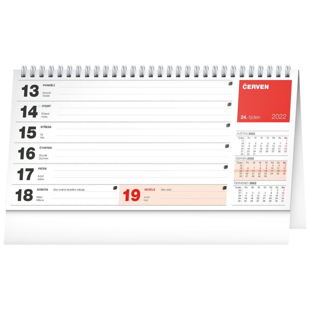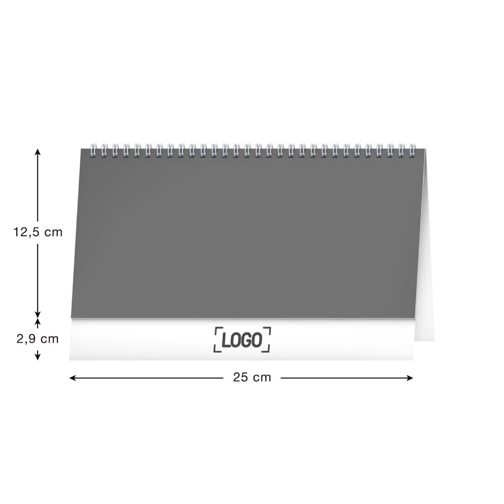 Rozměr: 25 x 12,5 cm Kalendárium: české týdenní Rozsah kalendáře: 30 listů (oboustranný tisk) Vazba: dvojitá spirála Papír: 80 g/m2 ofset Plocha pro potisk: 25 x 2,9 cm