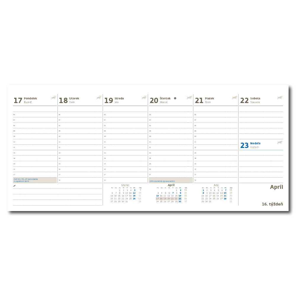 Rozměr: 30,1 x 13,5 cm Kalendárium: Slovenské týdenní sloupcové jmenné Rozsah kalendáře: 60 + 2 stran Stojánek: zámkový Vazba: Twin Wire Plocha pro potisk: 30,1 x 3,5