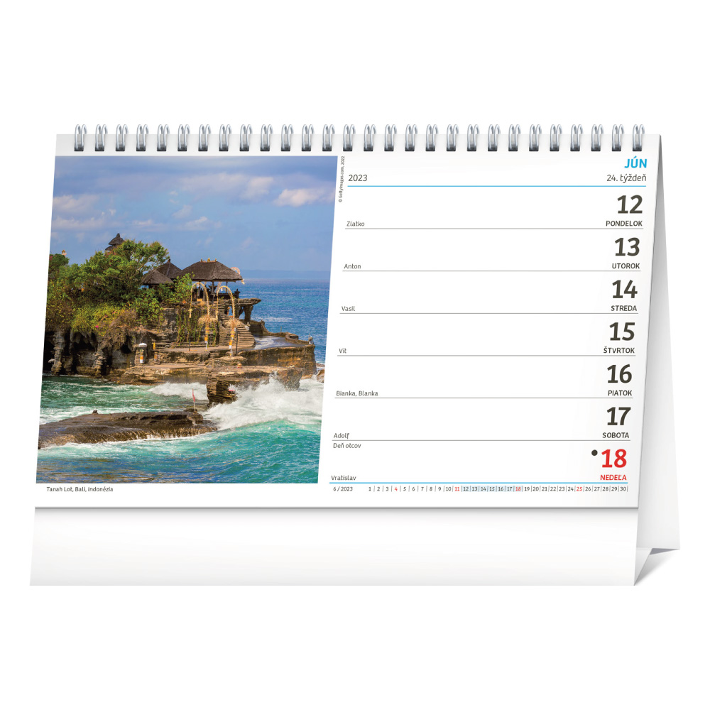 Rozměr: 23,1 x 14,5 cm Kalendárium: slovenské týdenní Rozsah kalendáře: 30 listů (oboustranný tisk) Vazba: dvojitá spirála Papír: 100 g/m2 Plocha pro potisk: 23,1 x 2,9 cm