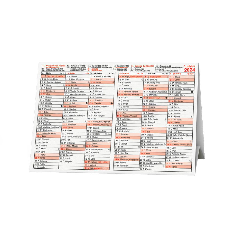 Rozměr: 210 x 140 mmKalendárium: české půlroční jmenné kalendáriumRozsah kalendáře: 2 stranyObsahuje měsíční fáze, roční období, letní a zimní čas.