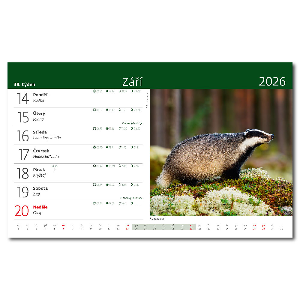 Obsahuje: doby lovu zvěře, východy a západy slunce a měsíce,