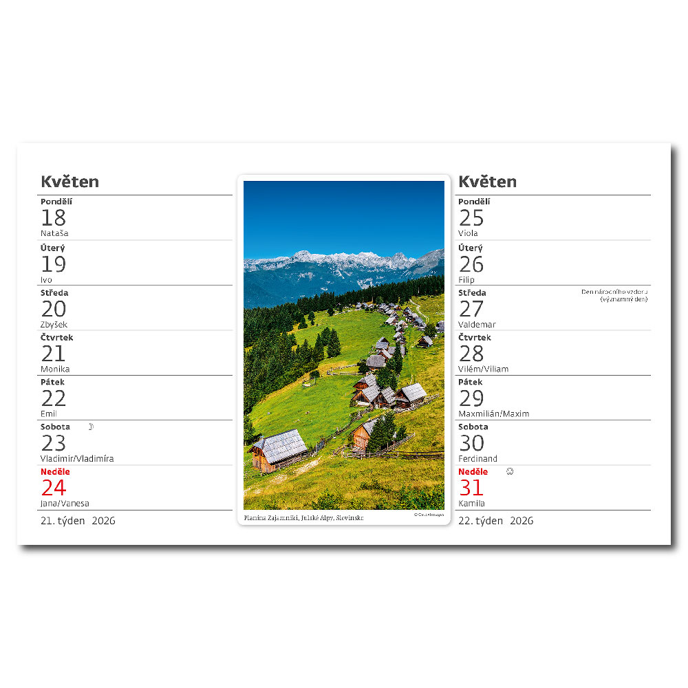Rozměr: 22,6 x 13,9 cm Kalendárium: České dvoutýdenní řádkové jmenné Rozsah kalendáře: 28 + 2 stran Stojánek: zámkový Vazba: Twin Wire Plocha pro potisk: 22,6 x 3 cm