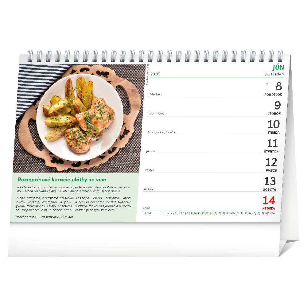 Rozměr: 23,1 x 14,5 cm Kalendárium: slovenské týdenní Rozsah kalendáře: 30 listů (oboustranný tisk) Vazba: dvojitá spirála Papír: 100 g/m2 Plocha pro potisk: 23,1 x 2,9 cm