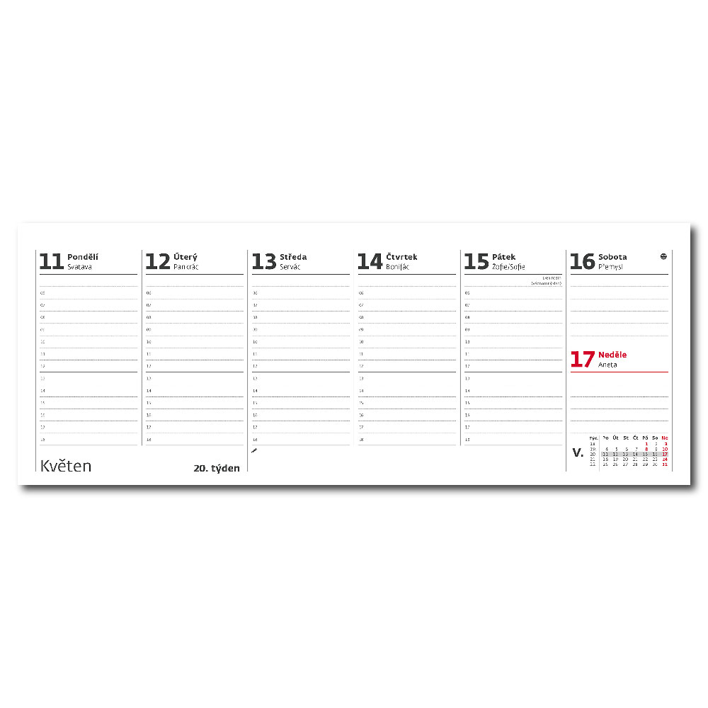 Rozměr: 24,6 x 9,6 cm Kalendárium: České týdenní sloupcové jmenné Rozsah kalendáře: 56 + 2 stran Stojánek: zámkový Vazba: Twin Wire Plocha pro potisk: 24,6 x 3,5 cm