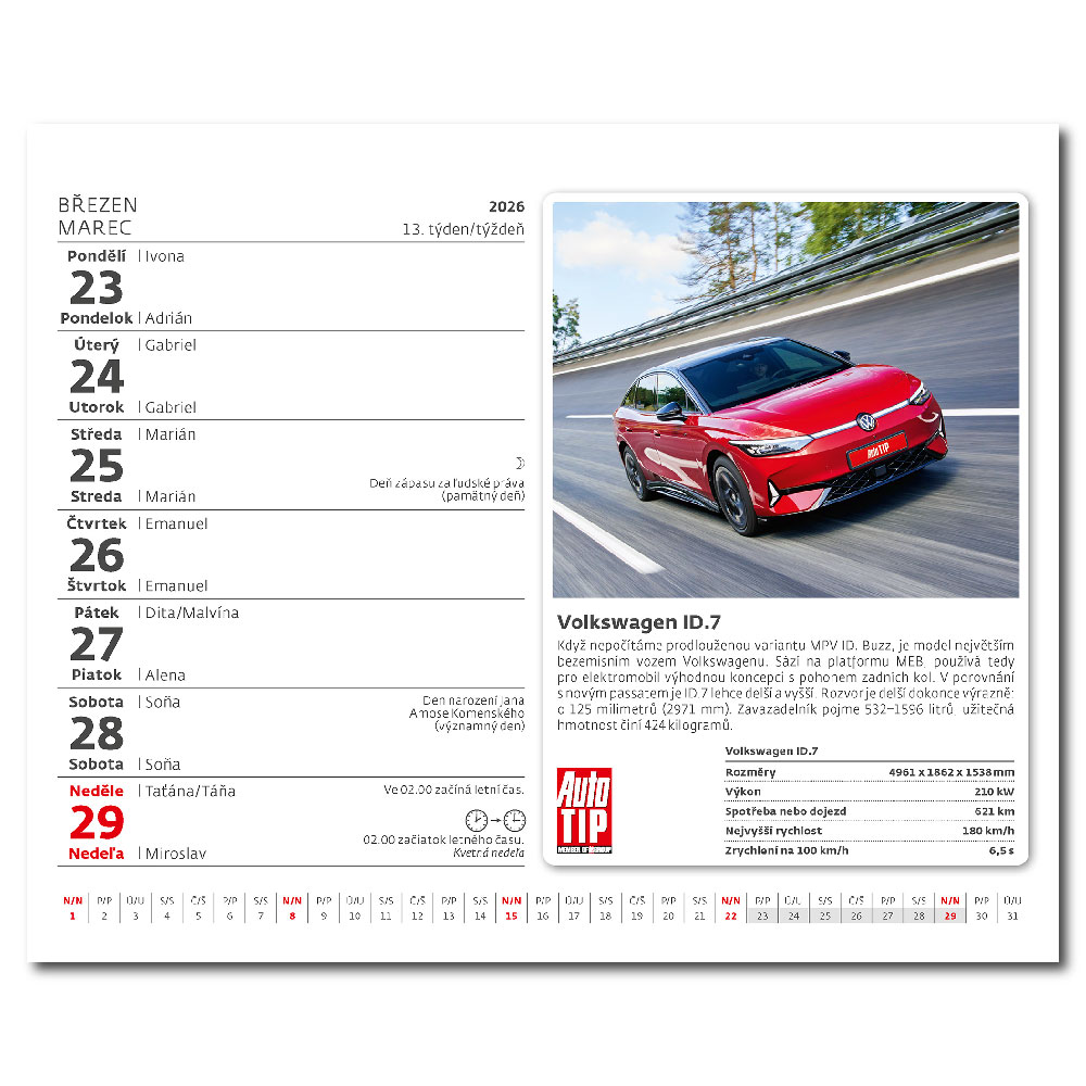 Rozměr: 17,1 x 13,9 cm Kalendárium: České/slovenské týdenní řádkové jmenné Vazba: Twin Wire Stojánek: zámkový Počet stran: 56 + 2 stran Plocha pro potisk: 17,1 x 2,5