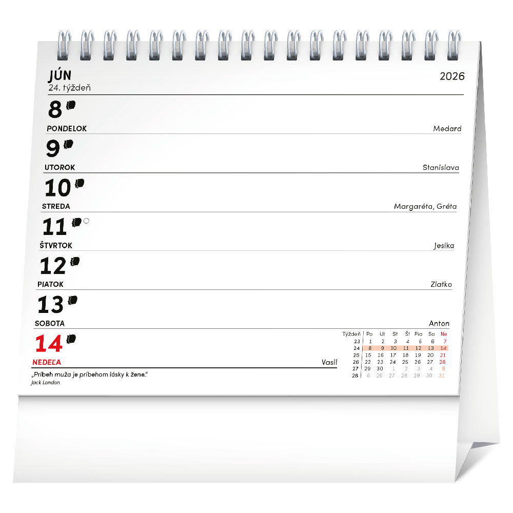 Rozměr: 16,5 x 13 cm Kalendárium: slovenské týdenní Rozsah kalendáře: 29 listů (oboustranný tisk) Vazba: dvojitá spirála Papír: 100 g/m2 Plocha pro potisk: 16,5 x 2,9 cm