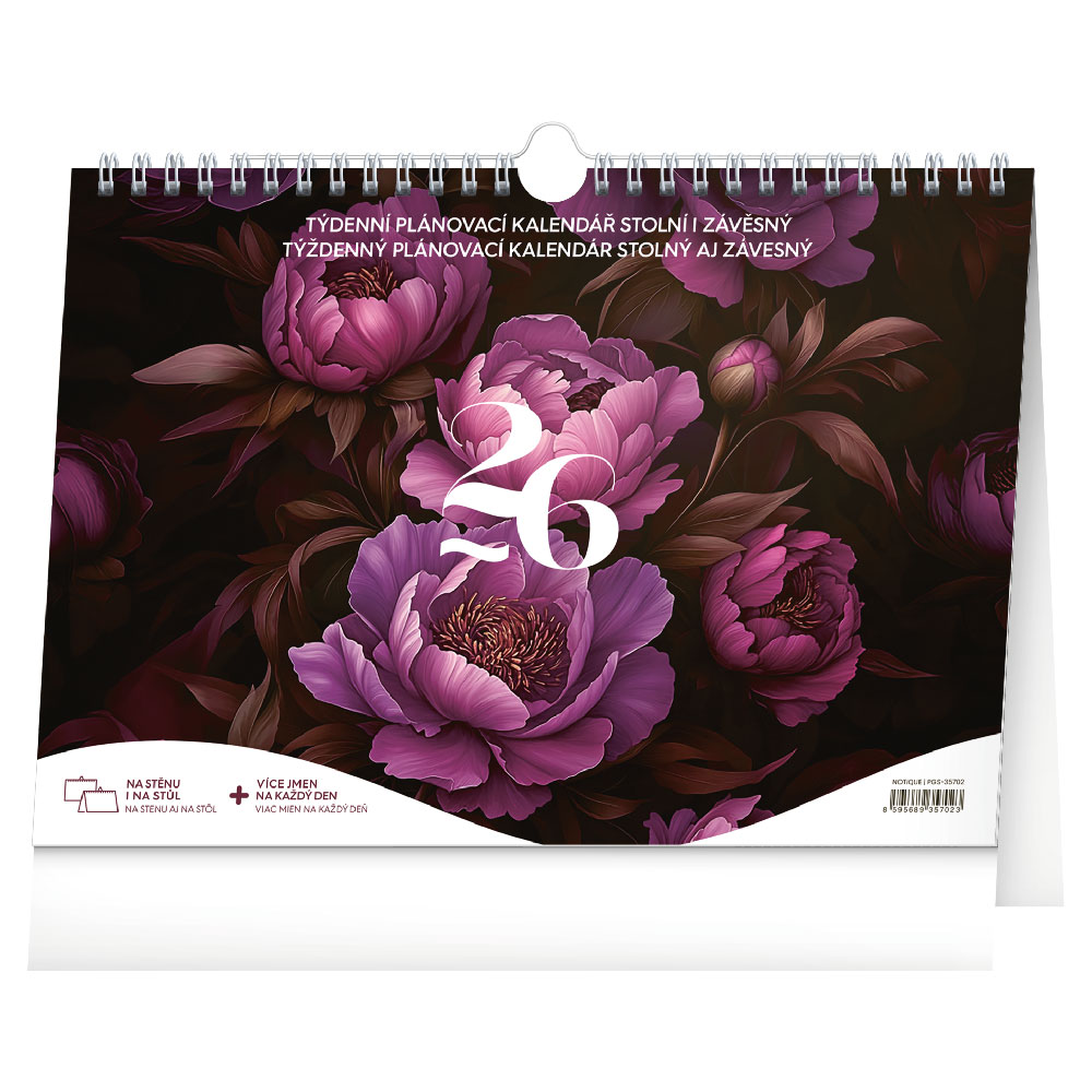 Rozměr: 30 x 21 cm Kalendárium: týdenní české a slovenské Rozsah kalendáře: 29 listů (oboustranný tisk) Vazba: dvojitá spirála s háčkem. Plocha pro potisk: 30 x 2,9 cm