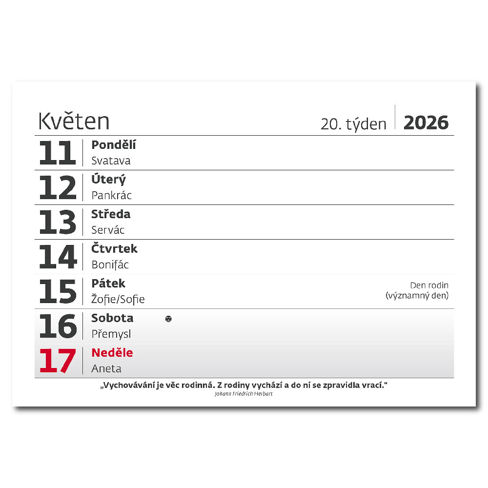 Rozměr: 21,1 x 14,8 cm Kalendárium: České týdenní řádkové jmenné Rozsah kalendáře: 54 + 2 stran Stojánek: zámkový Vazba: Twin Wire Plocha pro potisk: 21,1 x 3 cm