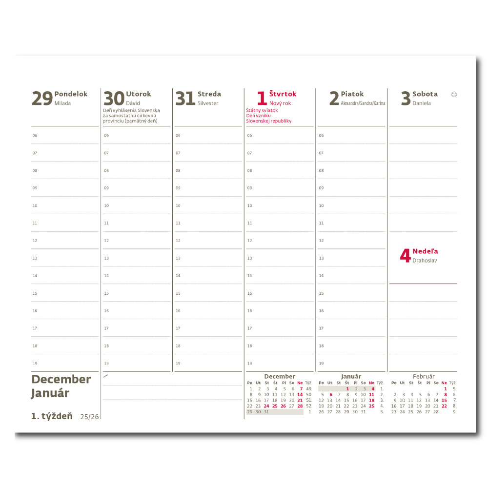 Rozměr: 17,1 x 13,9 cm Kalendárium: Slovenské týdenní sloupcové jmenné Rozsah kalendáře: 56 + 2 stran Stojánek: s plným dnem Vazba: Twin Wire Plocha pro potisk: 17,1 x 2,5