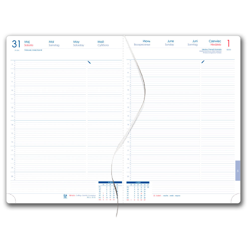 Diář obsahuje: kulaté odtrhávací rožky, bílou záložku a propisku