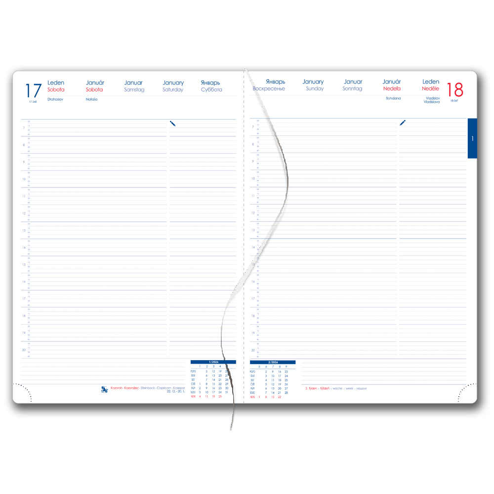 Diář obsahuje: kulaté odtrhávací rožky, bílou záložku a propisku