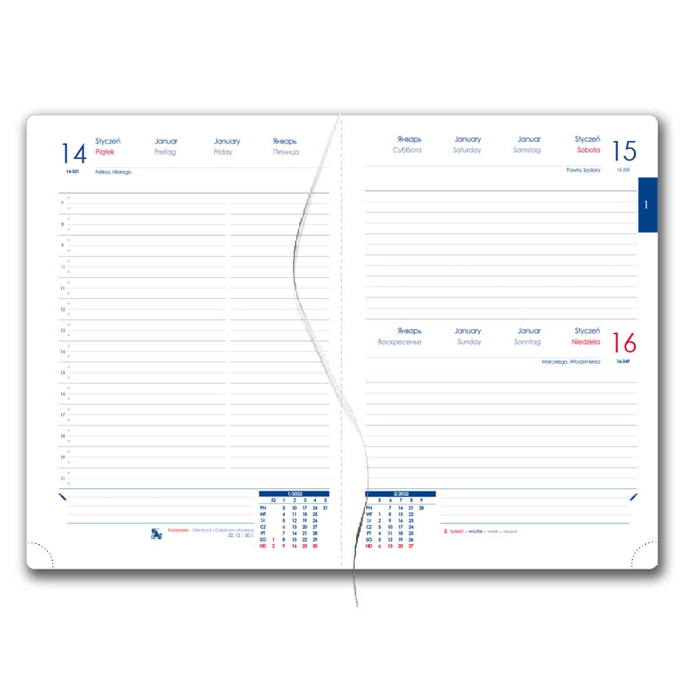 Diář obsahuje: kulaté odtrhávací rožky, bílou záložku a propisku