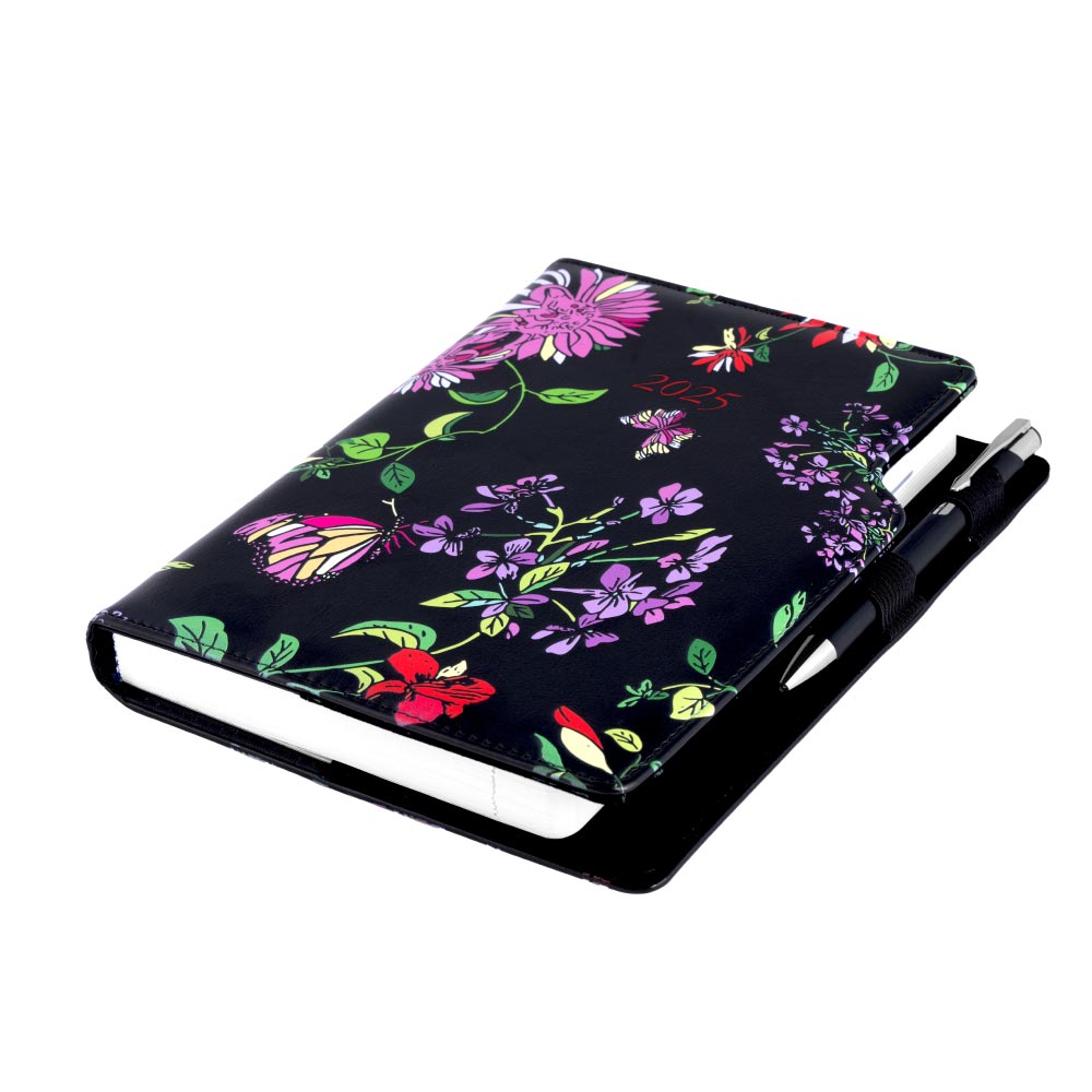 Diary DESIGN daily B6 2025 PL - black - flowers