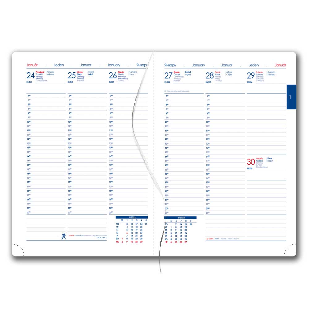 Diář obsahuje: kulaté odtrhávací rožky, bílou záložku a propisku