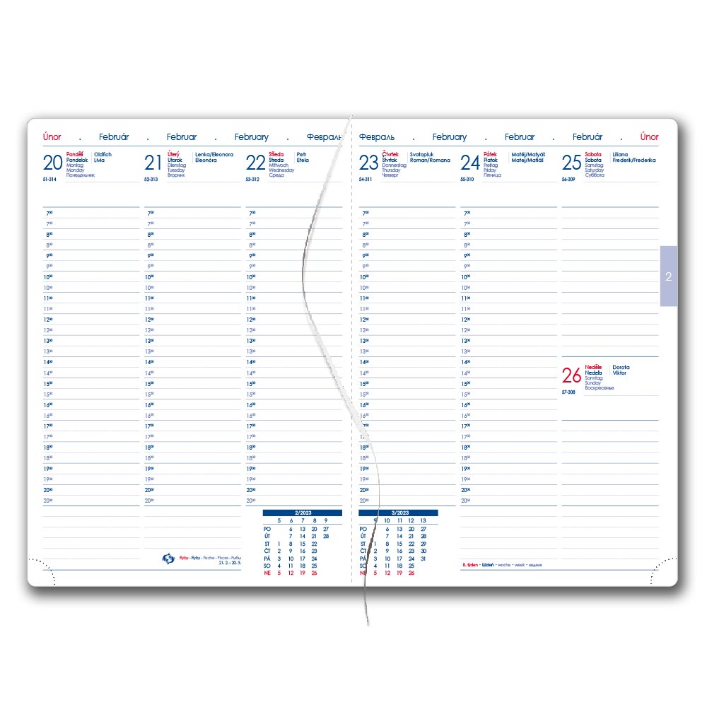 Diář obsahuje: kulaté odtrhávací rožky, bílou záložku a propisku
