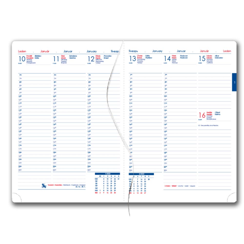 Diář obsahuje: kulaté odtrhávací rožky, bílou záložku a propisku