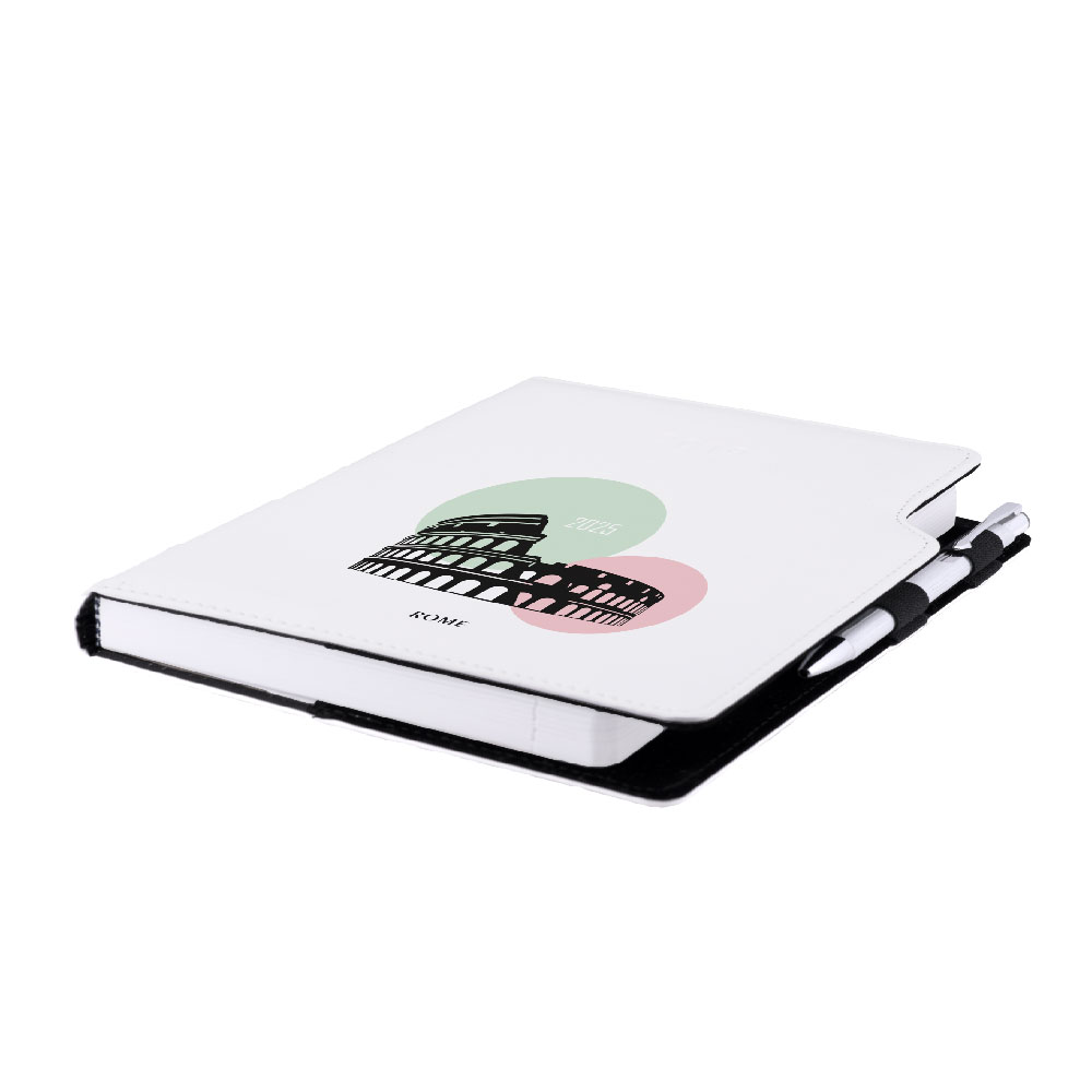 Diář obsahuje: kulaté odtrhávací rožky, bílou záložku a propisku