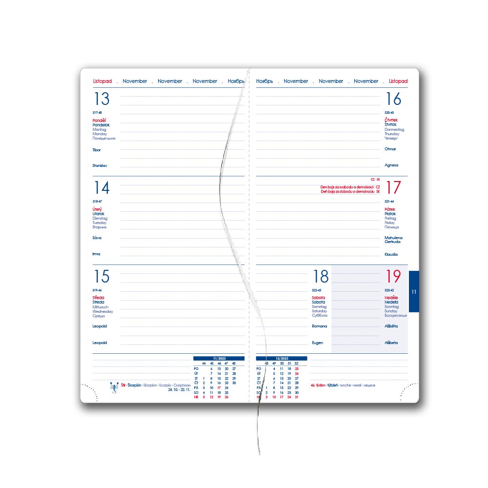 Diář obsahuje: kulaté odtrhávací rožky, bílou záložku a propisku