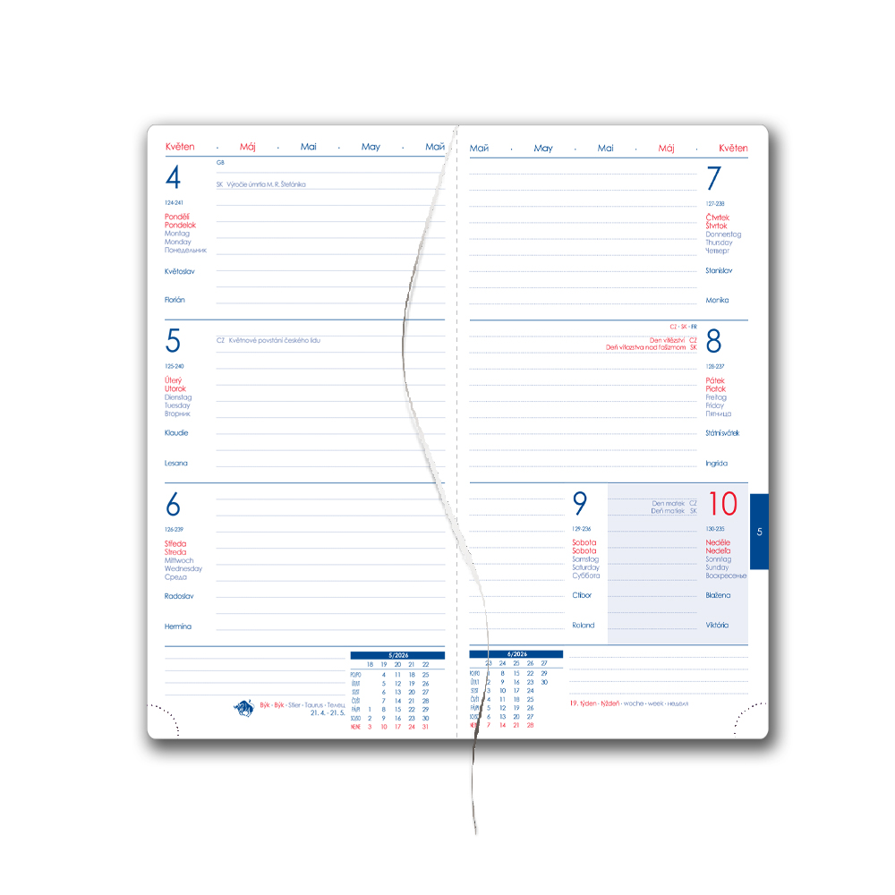 Diář obsahuje: kulaté odtrhávací rožky, bílou záložku a propisku