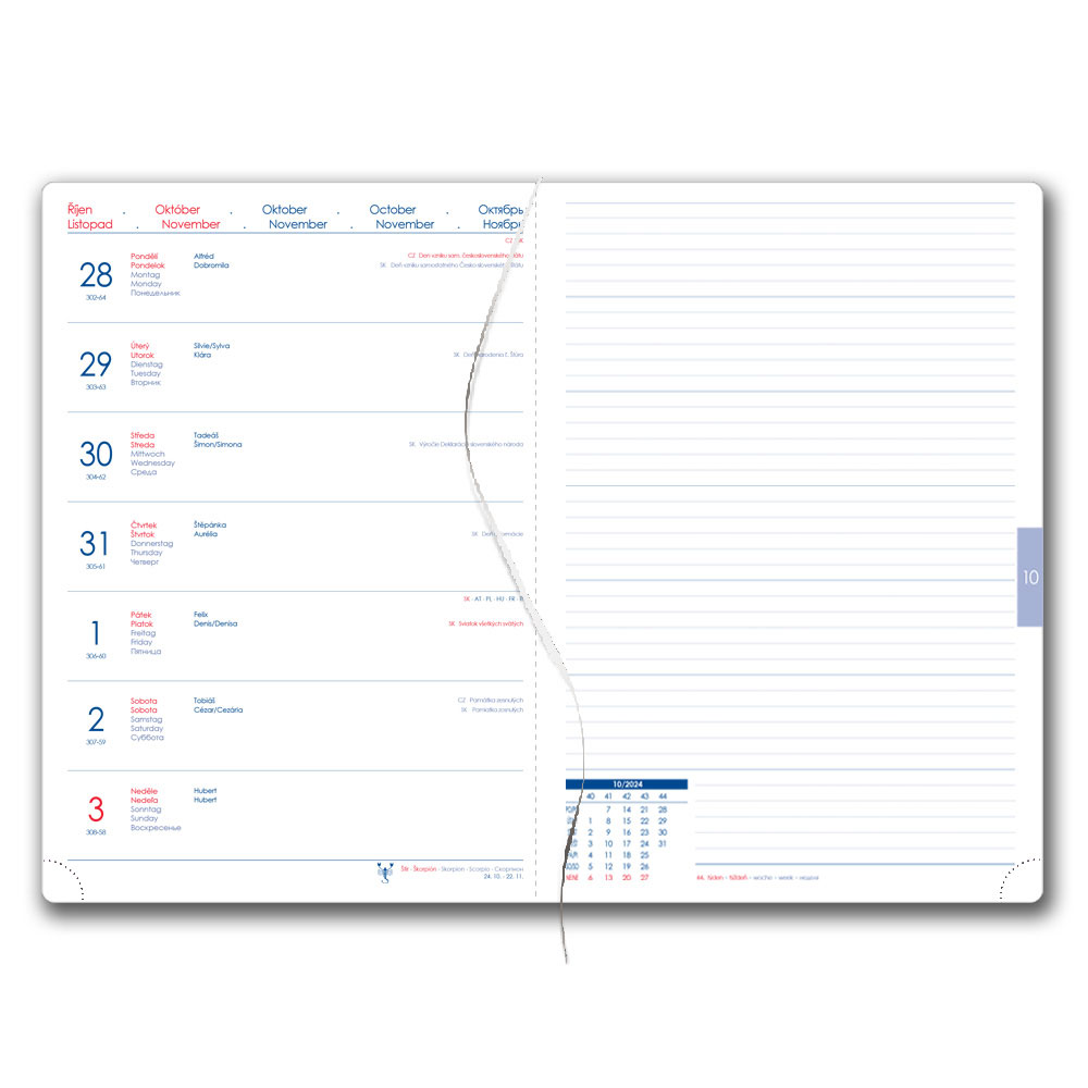 Kalendárium: týdenní jmenné CZ/SK na jedné straně + samostatná strana na poznámky