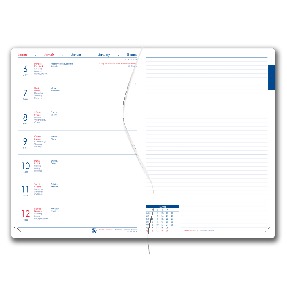 Kalendárium: týdenní jmenné CZ/SK na jedné straně + samostatná strana na poznámky