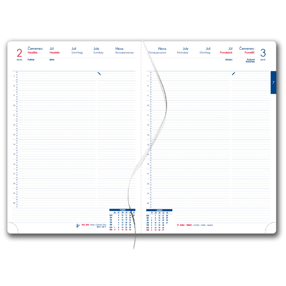 Diář obsahuje: kulaté odtrhávací rožky, bílou záložku a propisku