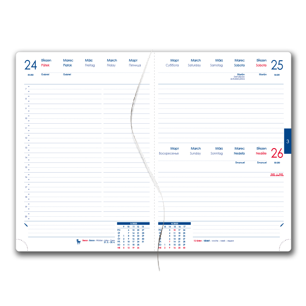 Diář obsahuje: kulaté odtrhávací rožky, bílou záložku a propisku