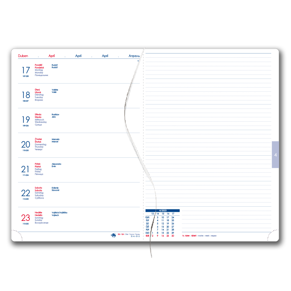 Kalendárium: týdenní jmenné CZ/SK na jedné straně + strana na poznámky