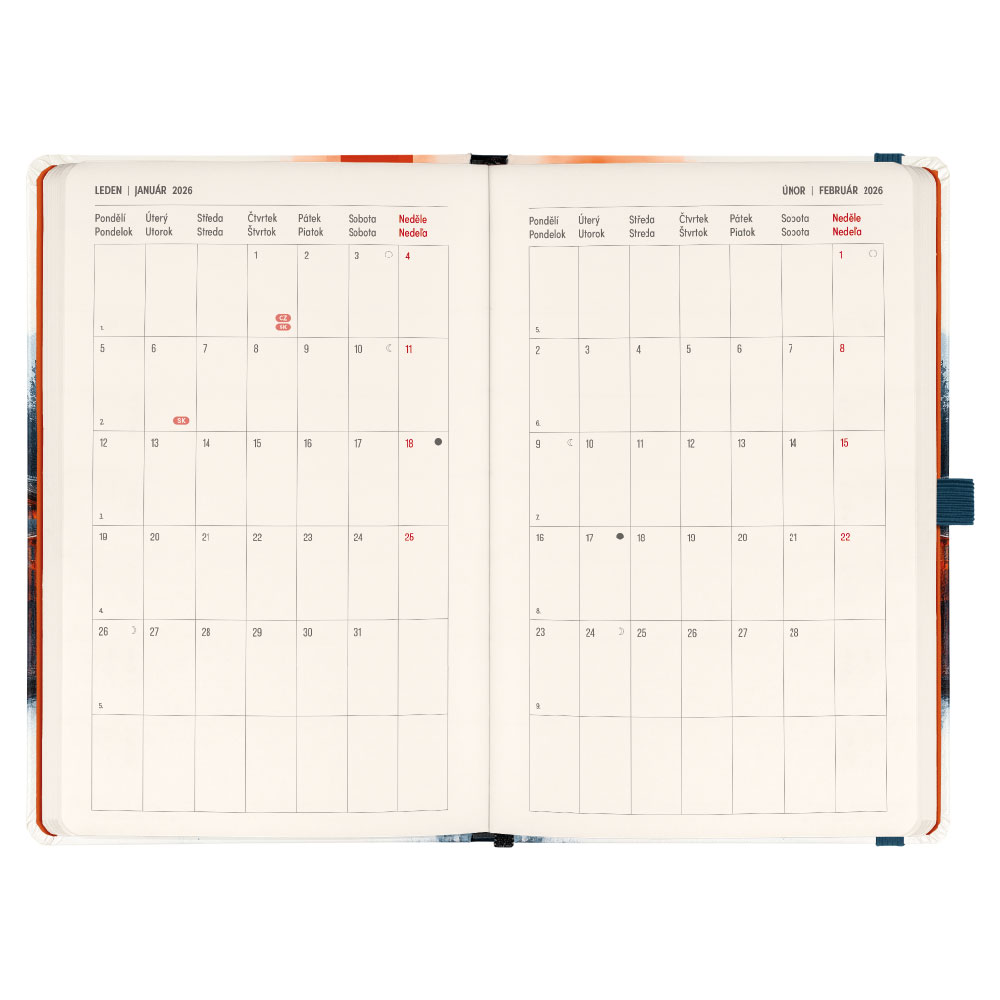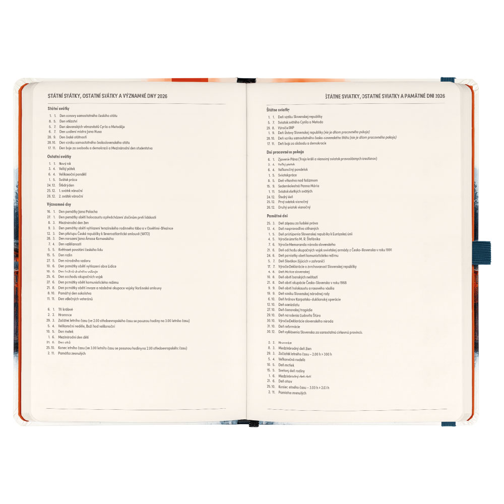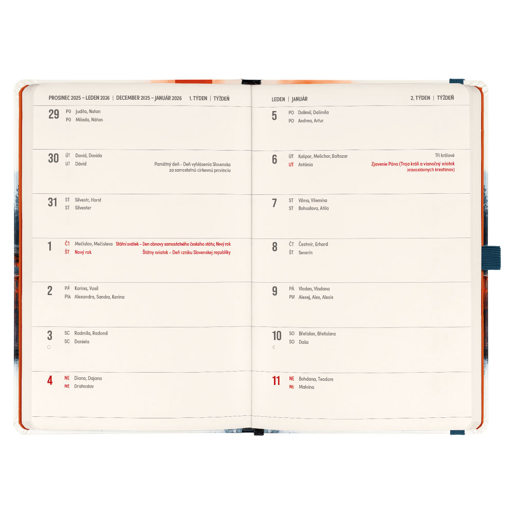 Součástí je záložka, poutko na tužku a vnitřní kapsa.
