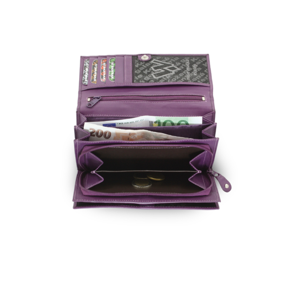 2 přihrádky na bankovky + 1 zdvojená zipová kapsa na mince,