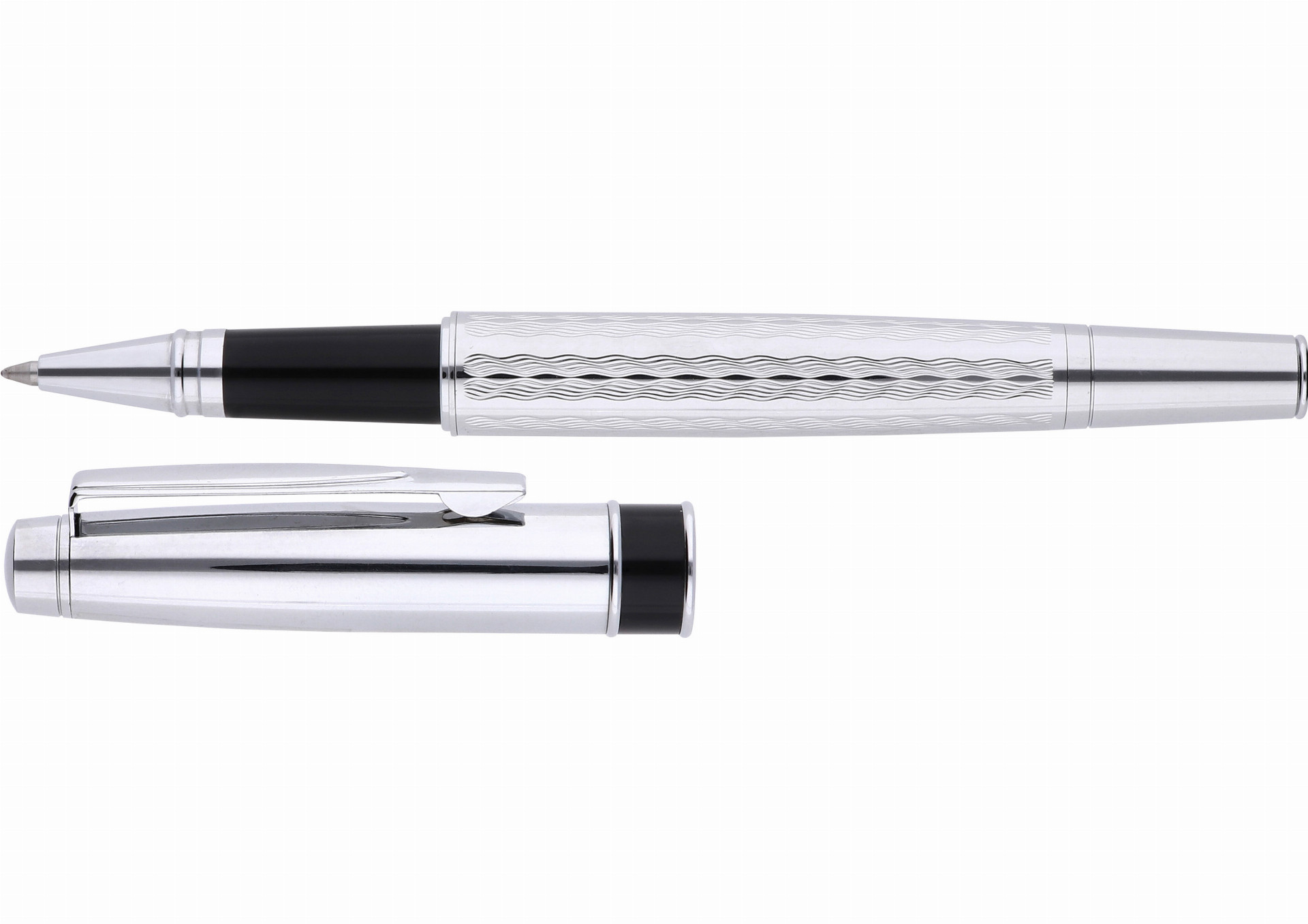 Luxusní kovový roller s broušenými a lesklými doplňky, modrá náplň.