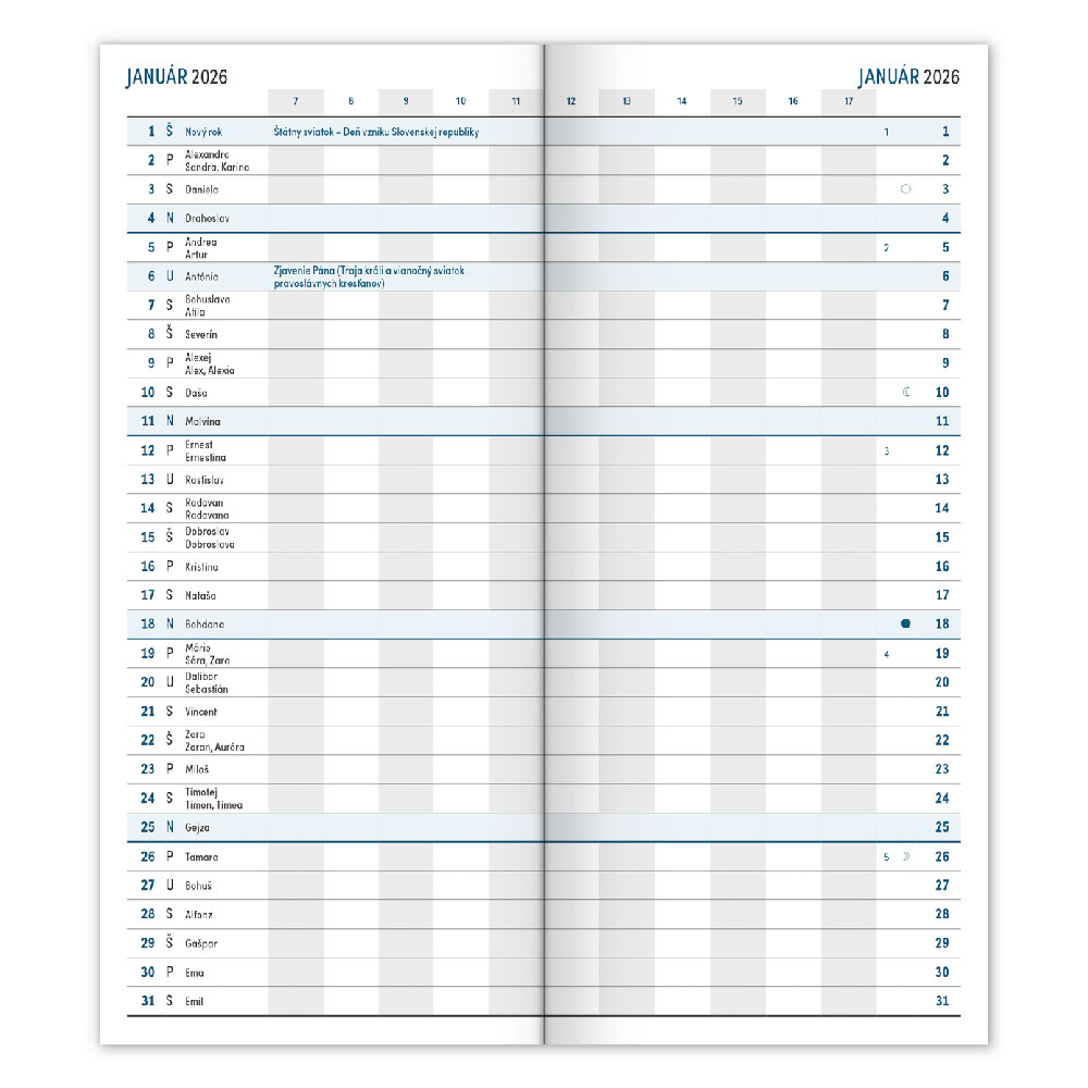 Diář obsahuje: přehledný kalendář 2026 a 2027,