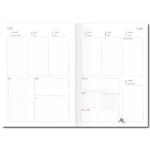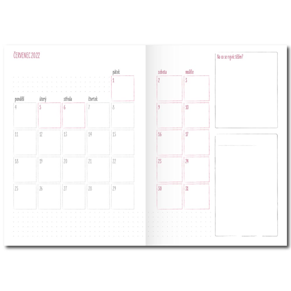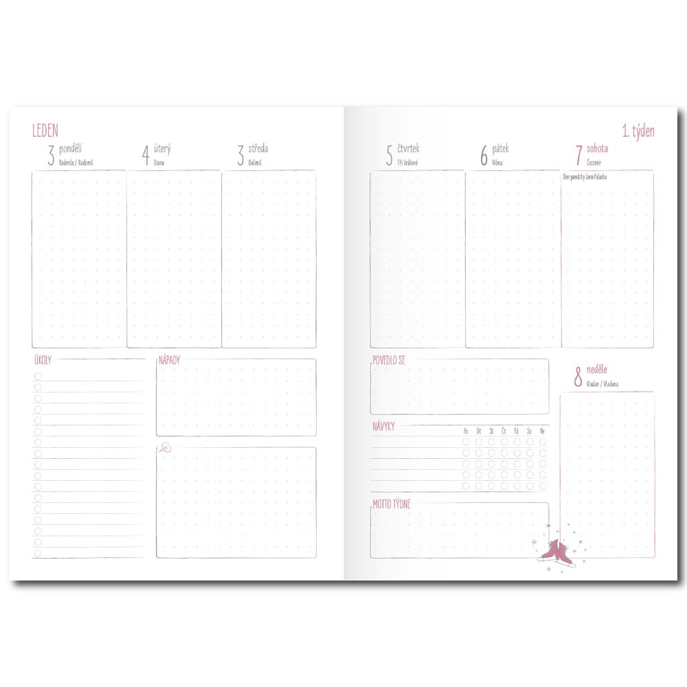 Motivační diář pro efektivní plánování, doplněný drobnými ilustracemi.