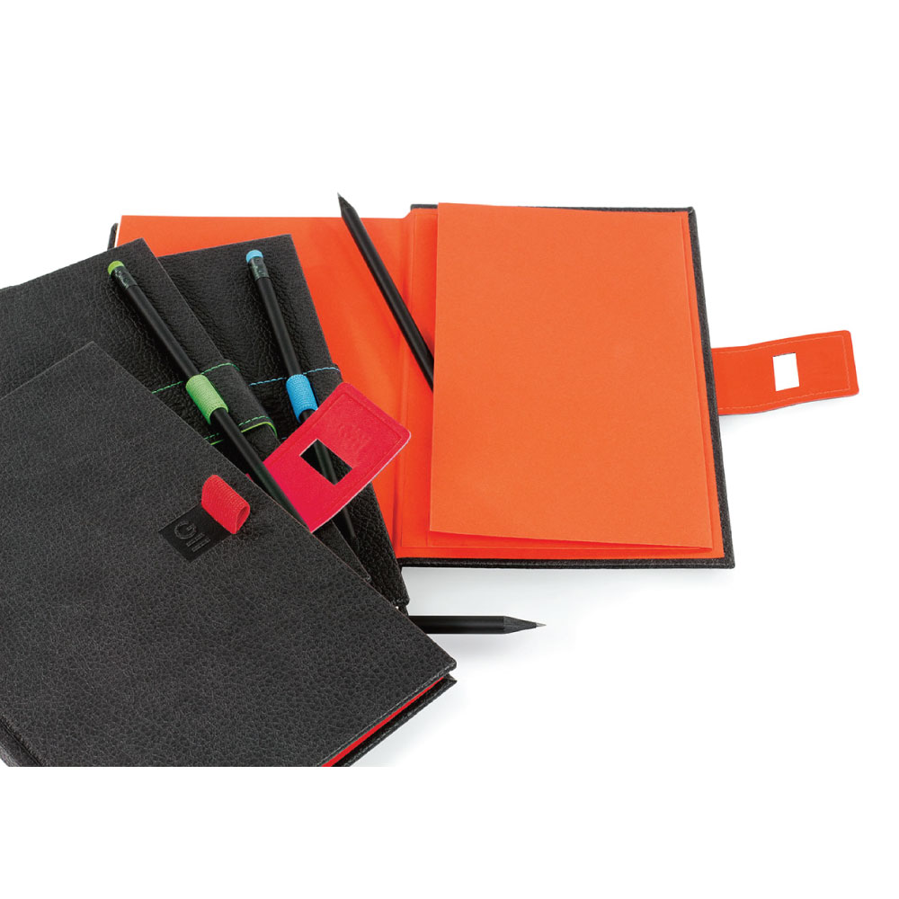 Notes obsahuje papírovou kapsu, poutko na tužku
