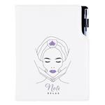 Format: B5 Größe: 170 x 240 mm Material:mit Schaumstoff gepolsterte Pappe, bezogen mit glattem Kunstleder und aufgedruckten Grafiken Innenmaterial: schwarz Samt Blockfarbe: Weiß Lesezeichen: genäht V8 (gewebter Faden) Papiert: liniert mit Perforieru